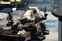 If it can be summed up in one cheap shot it's that Furman talks the talk but can't walk the walk. There are several opportunities to show that this is a brave new comic where everything you know before is void, and they're all fumbled. Despite almost painful attempts to justify it in the story, we still have three kids snooping in a Decepticon base like something out of a Saturday morning cartoon. Even then there's a chance for a statement to be made - Bumblebee describes the intrepid trio as acceptable casualties and it's clear the Autobot doctrine on Earth means their lives are a minor priority weighed against the other six billion on the planet. But it's empty bravado - a last minute escape from a Decepticon air strike comes panels after a super sequence where Megatron spots Verity and instantly dismisses her as an insect not worth caring about. Killing off one of the humans - even third wheel Jimmy - would have been a fantastic way of declaring that all bets were off.